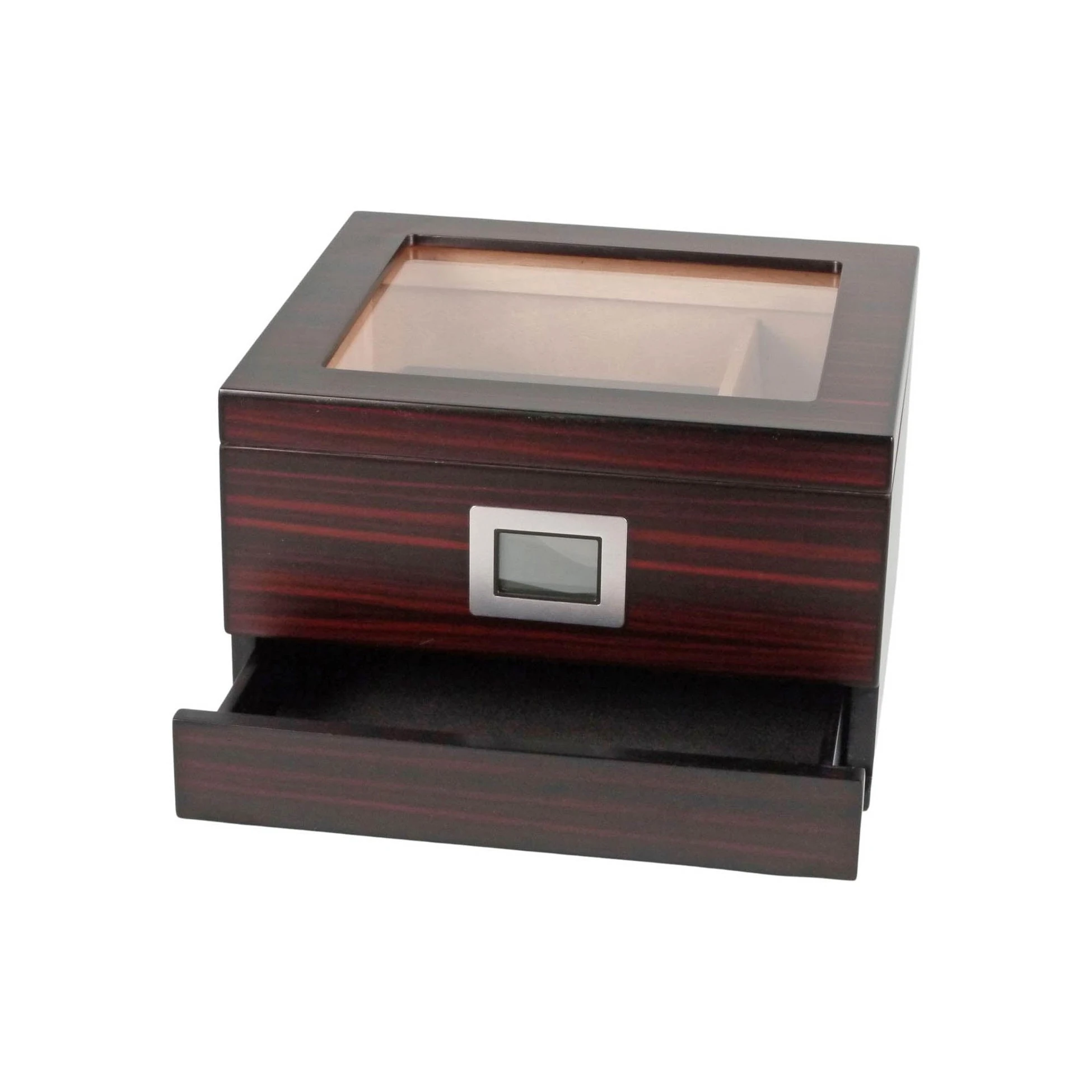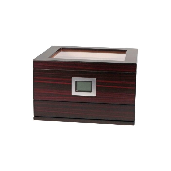 Cigar humidor with a glass lid drawer capacity of 30 to 40 cigars.